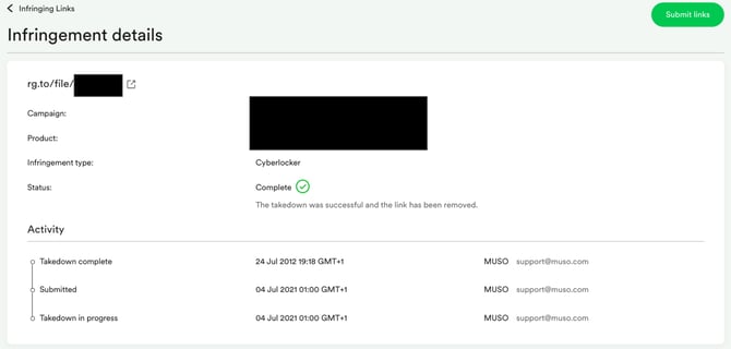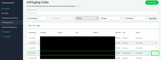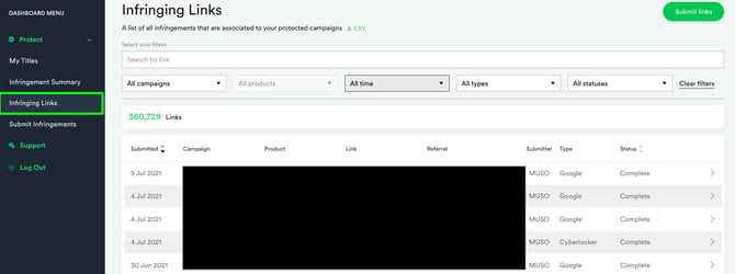 Within the Infringing Links section of the MUSO dashboard you can view the details of every infringement